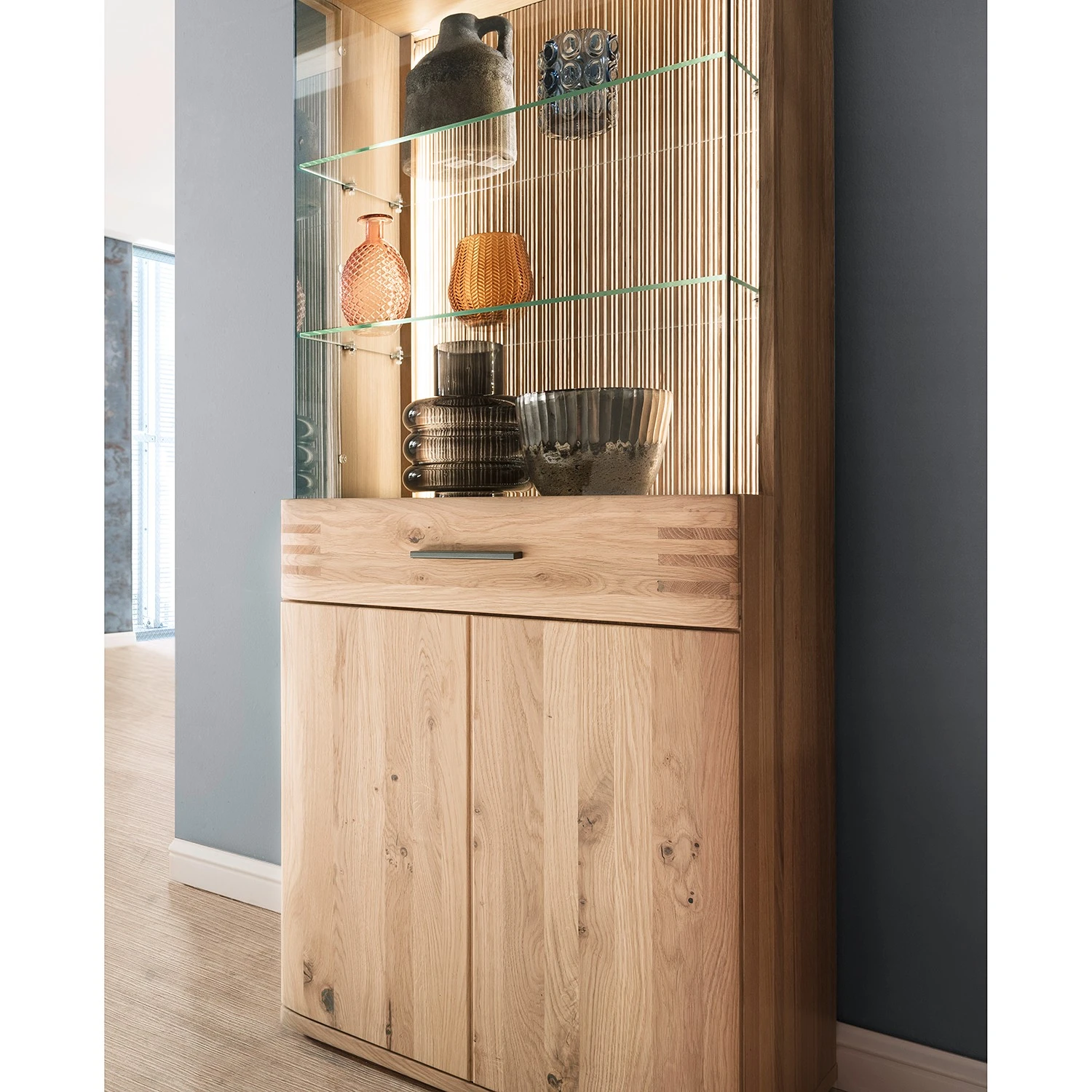 - Lieferumfang: 1 Vitrine, 1 Hängeregal & 1 Lowboard ohne Beleuchtung & Dekoration