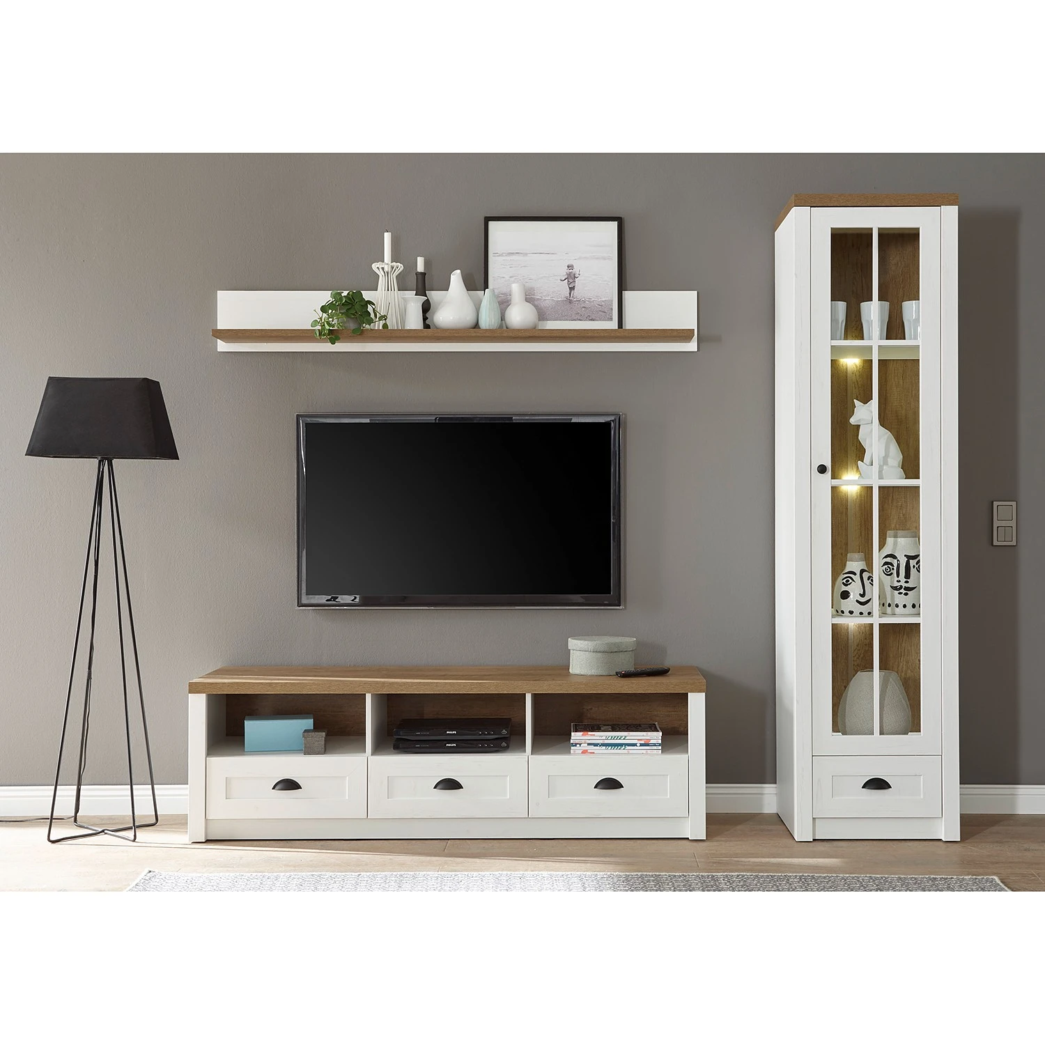 - Lieferumfang: 1 Wandboard, 1 Lowboard & 1 Regal ohne Beleuchtung & Dekoration
