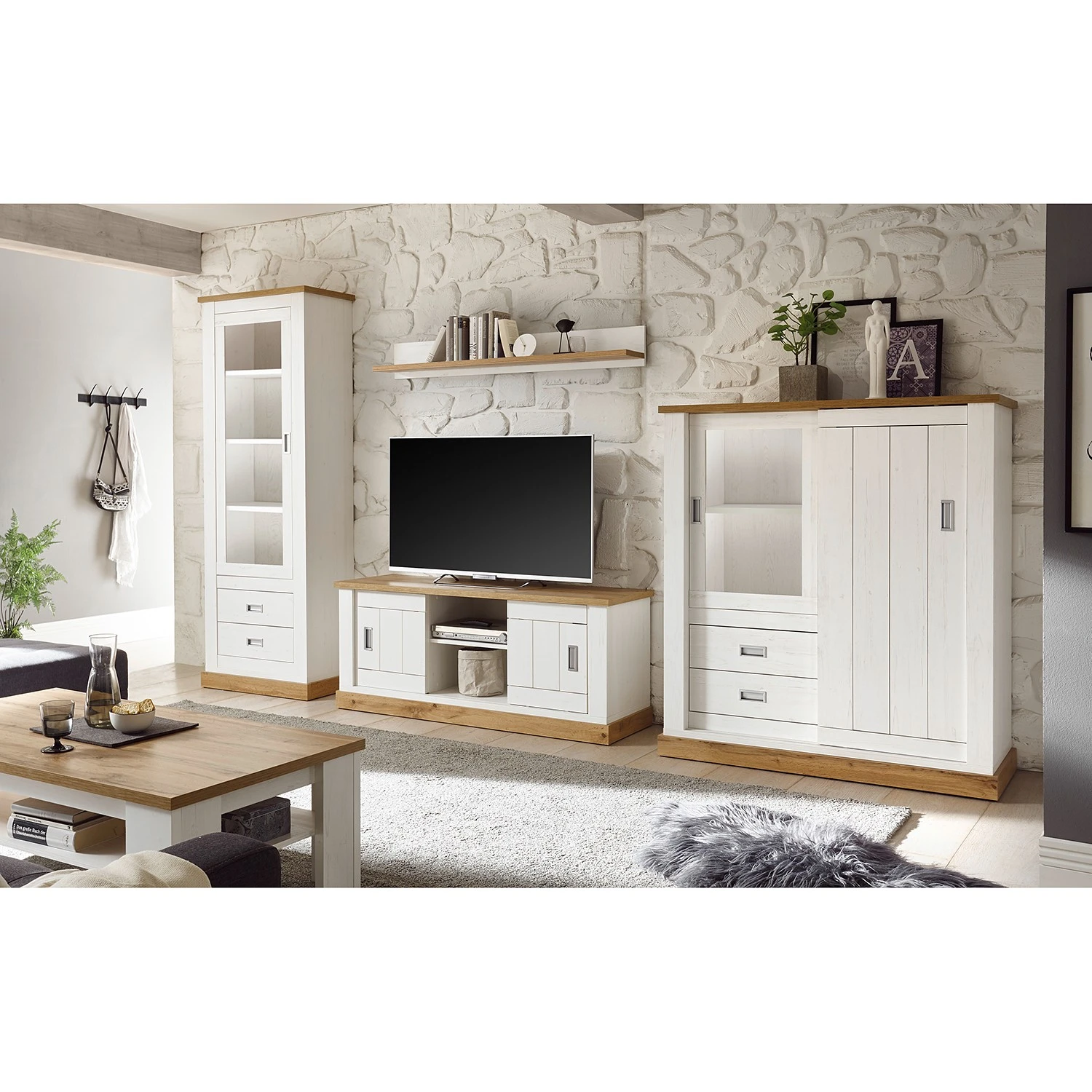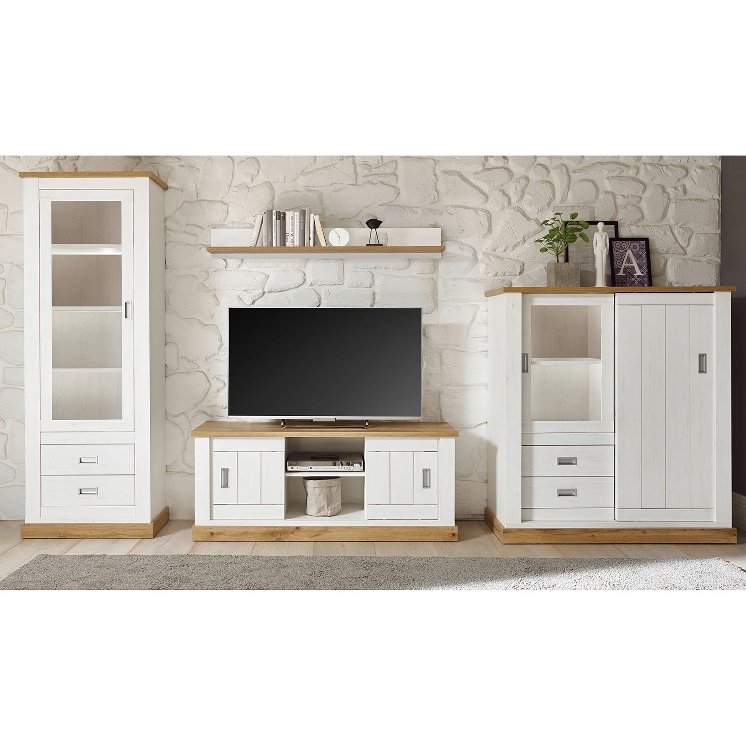 - Lieferumfang: Wohnwand bestehend aus 1 Highboard, 1 Vitrine, 1 Wandboard & 1 Lowboard ohne Beleuchtung & Dekoration