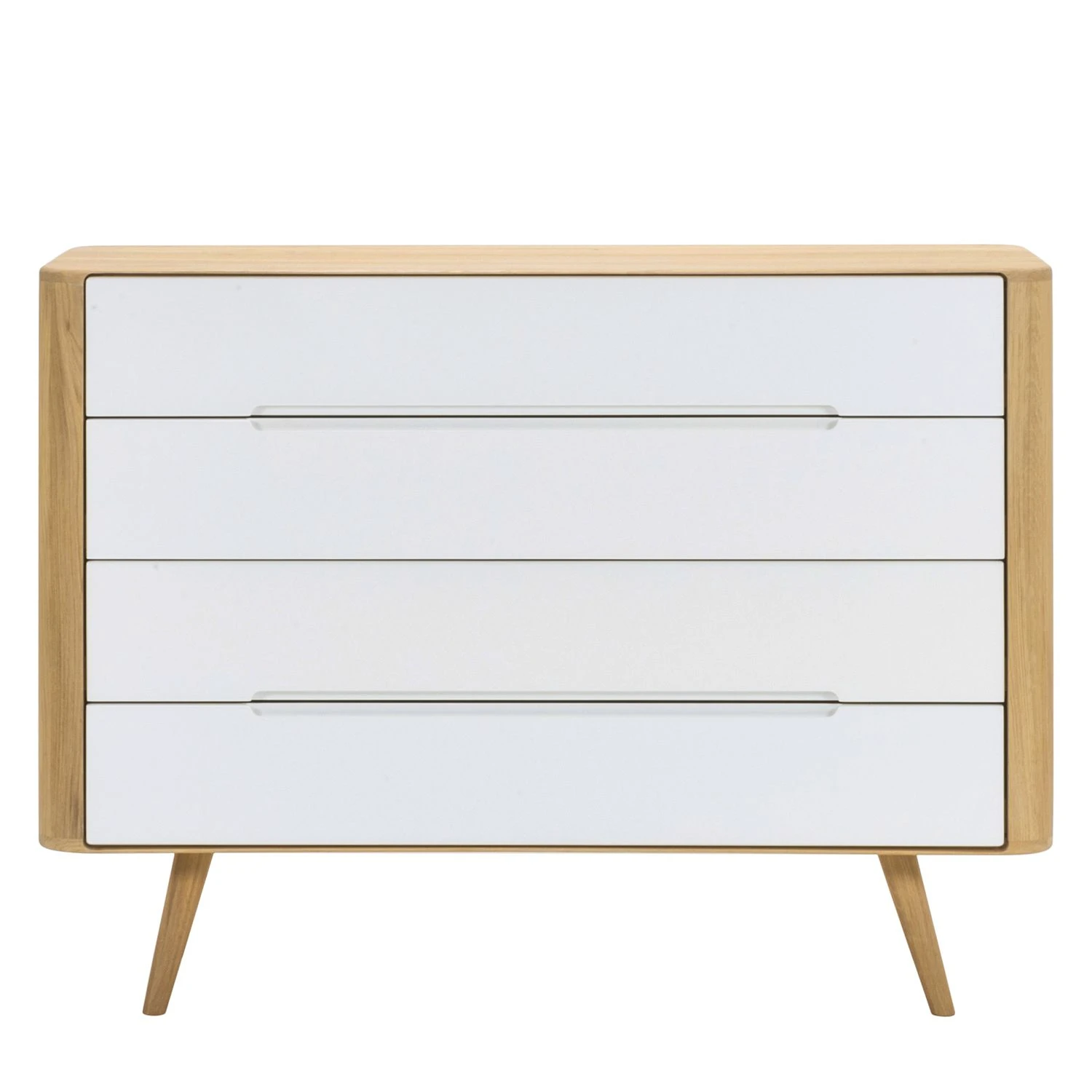 Vom Stil der 1960er-Jahre inspiriert hat der Designer Salih Teskeredžic diese Kommode Loca II entworfen, die vor allem aufgrund ihrer Geradlinigkeit und hochwertigen Materialien ins Auge fällt. Der Korpus und die leicht schräg gestellten Beine sind aus massiver Wildeiche gefertigt. Das Holz wurde geölt, sodass seine ganz eigene Maserung perfekt zur Geltung kommt. Die Front aus lackierter MDF-Platte setzt farblich einen schönen Kontrast dazu. Durch die sanft abgerundeten Kanten wird der stilvolle Entwurf des Möbels perfekt unterstrichen. Auch durch die minimalen länglichen Griffmulden der vier Schubladen, die mit einer praktischen Soft-Close-Funktion ausgestattet sind, kommt die geschmackvolle Gestaltung der Kommode Loca II zum Ausdruck.